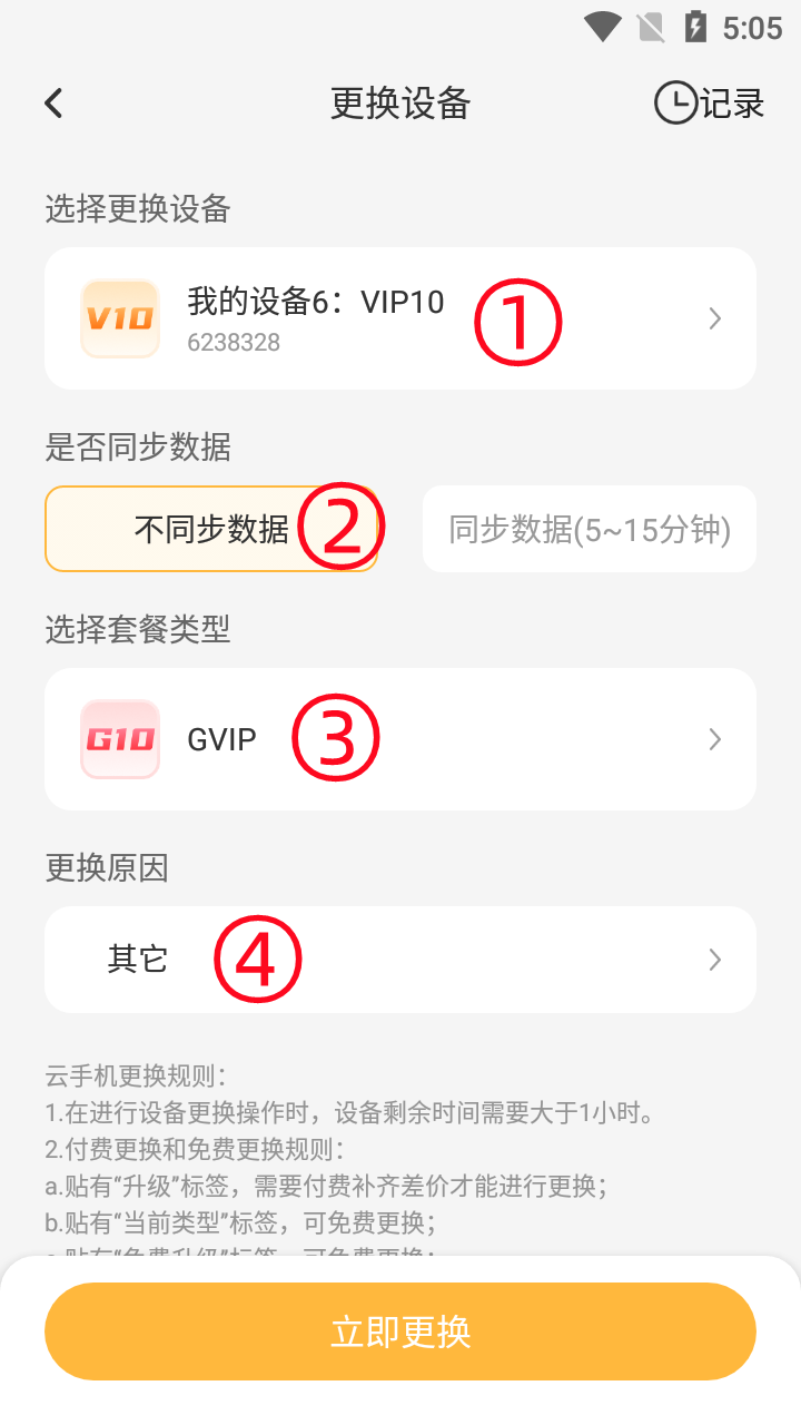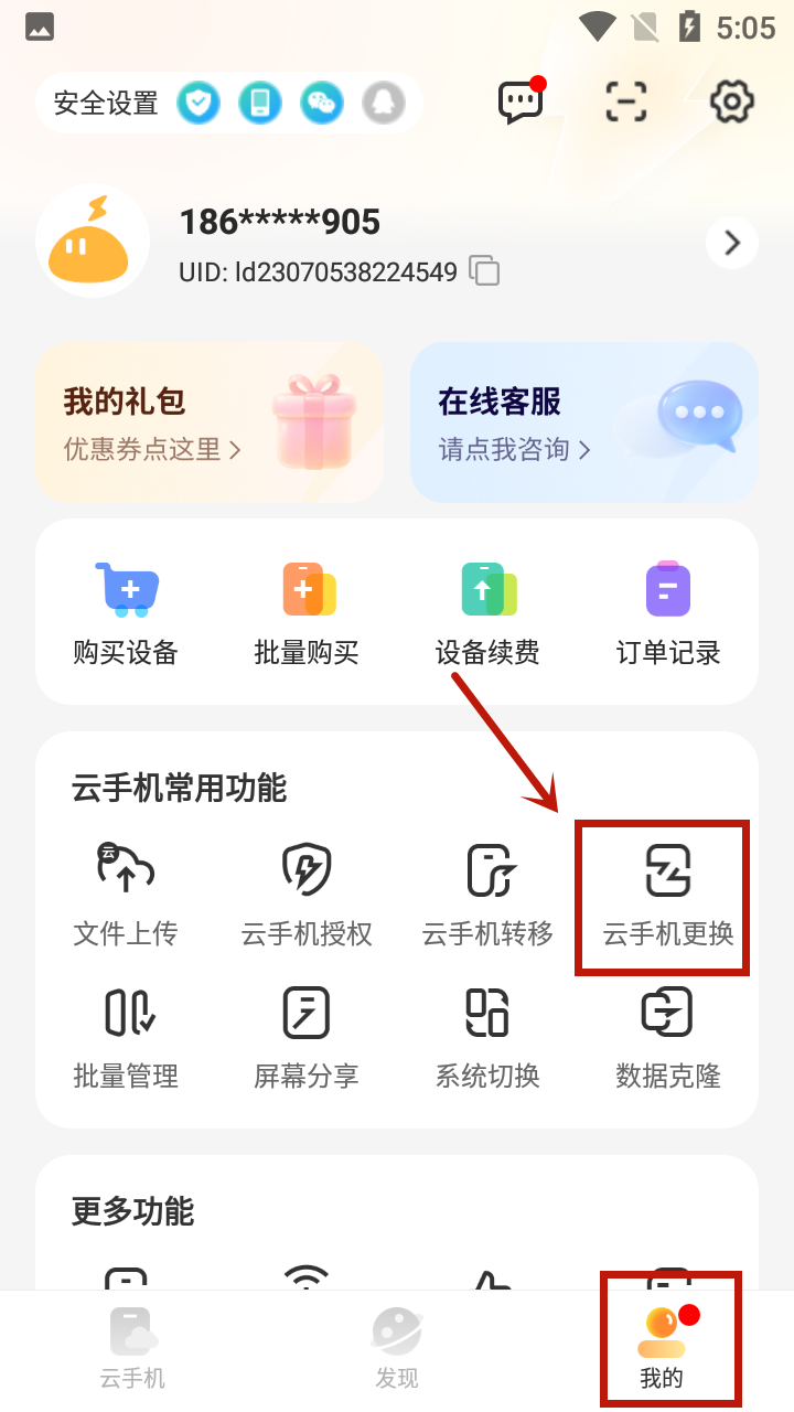 1、在“我的”界面,选择“云手机更换”